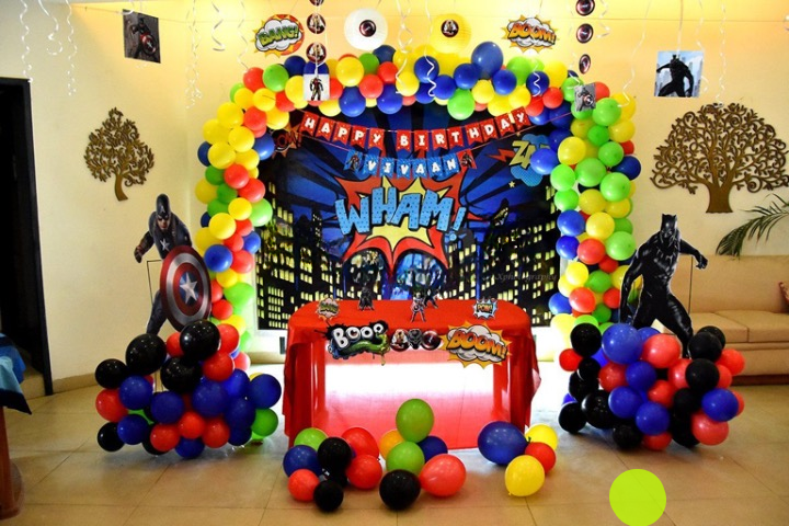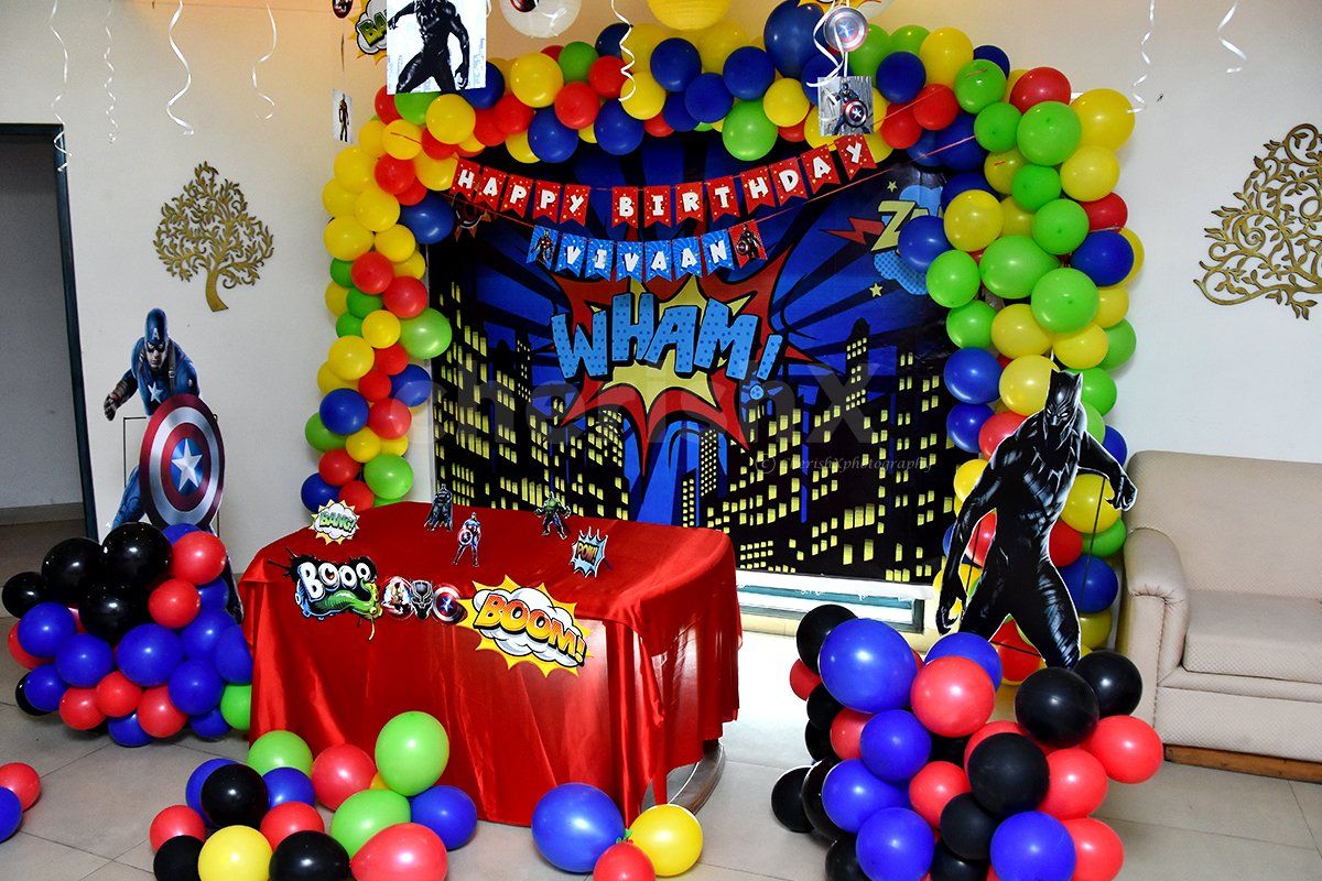Avengers-themed birthday decoration with comic-style backdrop, superhero cutouts, colorful balloon arch & action props for a bold, fun celebration.