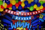 Unleash superhero power with this vibrant Avengers-themed birthday decoration setup! Featuring bold comic-style elements like a “WHAM!” cityscape backdrop, this setup includes Captain America and Black Panther standees, a full rainbow balloon arch (red, blue, yellow, green, and black), and a festive “Happy Birthday” banner customized with your child’s name.