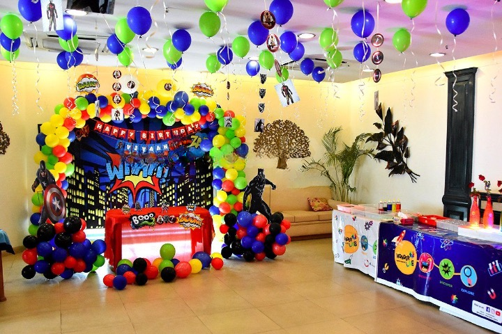 Avengers Theme Birthday Decoration Setup with Superhero Backdrop, Balloon Arch & Table Decor