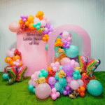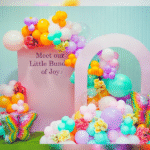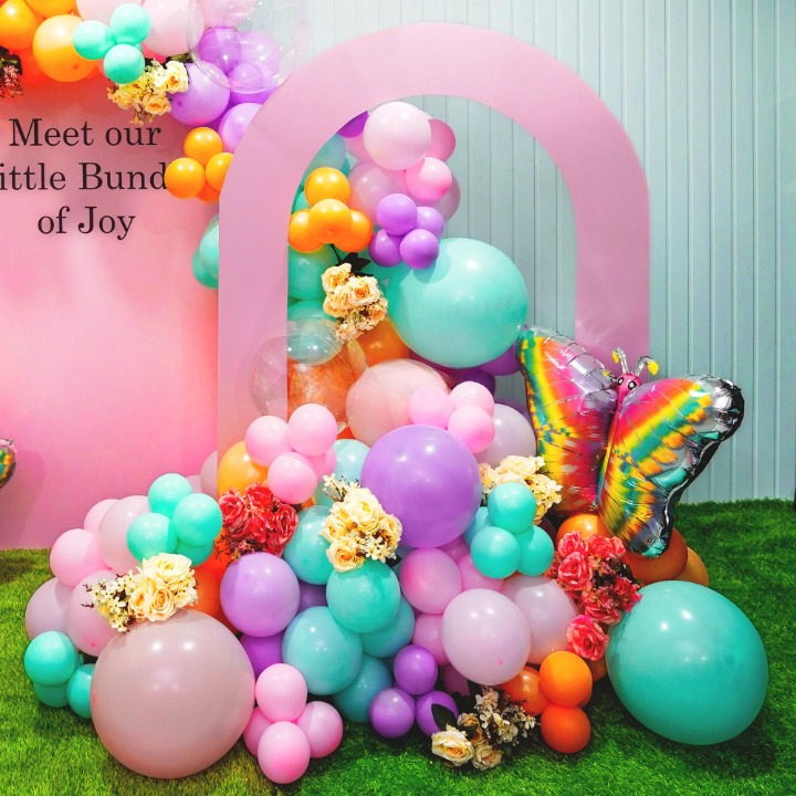 Welcome your newborn in style with this bright and joyful baby welcome decoration setup. Featuring a colorful mix of balloons in pastel and neon tones, floral accents, and rainbow butterfly foils, this decor creates the perfect photo-worthy backdrop to introduce your little bundle of joy.