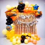 Make your child’s birthday a fun-filled adventure with this Construction Theme Birthday Decoration Setup! Featuring vibrant yellow, orange, and black balloons, this setup includes foil balloons shaped like an excavator, construction truck, and cranes to bring a real construction zone feel to your party.