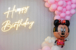 Celebrate in style with this stunning Pink & Gold Minnie Mouse balloon setup. Includes neon signage, 3D balloon base, and adorable Minnie head design.