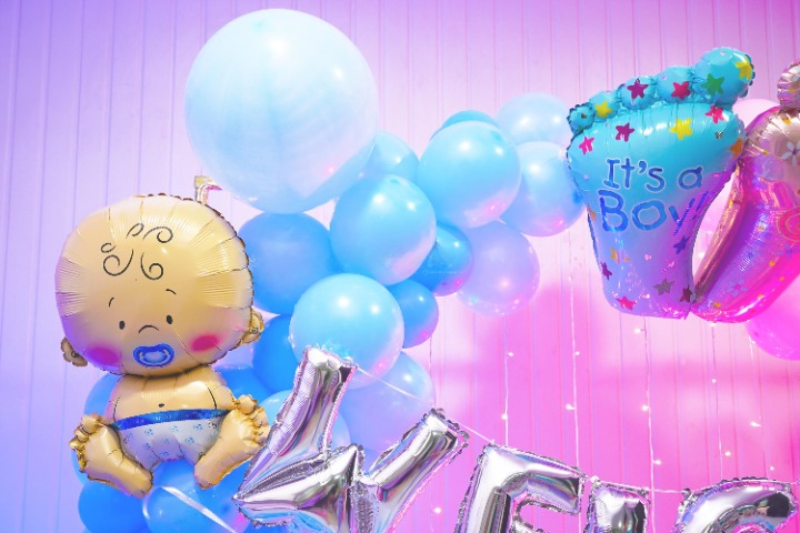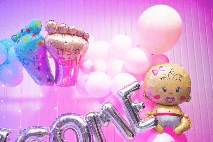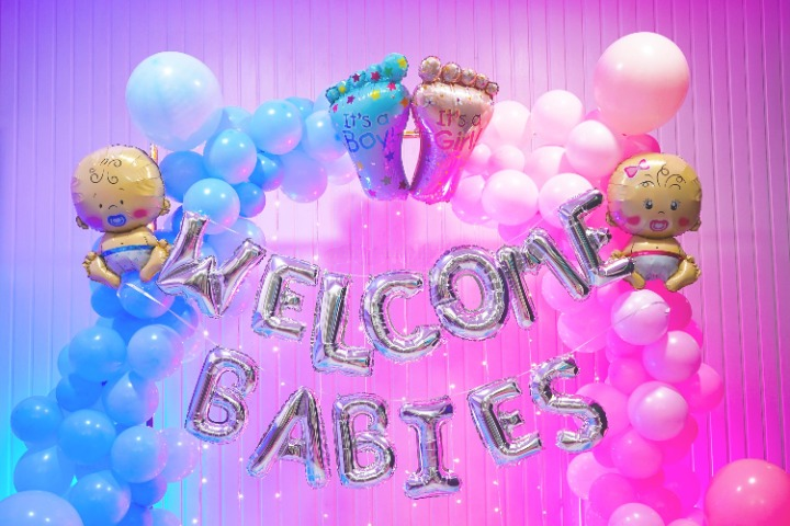 The vibrant lighting and festive colors make this setup ideal for indoor venues, maternity shoots, or baby homecomings. Whether you’re celebrating a boy, a girl, or both – this decor adds charm, love, and magic to your special day.